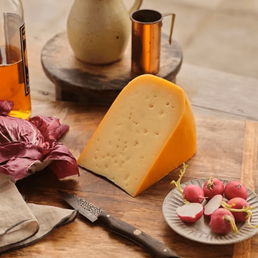 Crafted by the Cornish Gouda Co., our Mature Cornish Gouda is aged for 10-12 months, developing complex creamy, nutty, and caramel flavours. The delightful crunch you experience comes from calcium lactate crystals formed during the aging process. This cheese is highly recommended for an after-dinner cheeseboard, adding a touch of sophistication to any gathering.