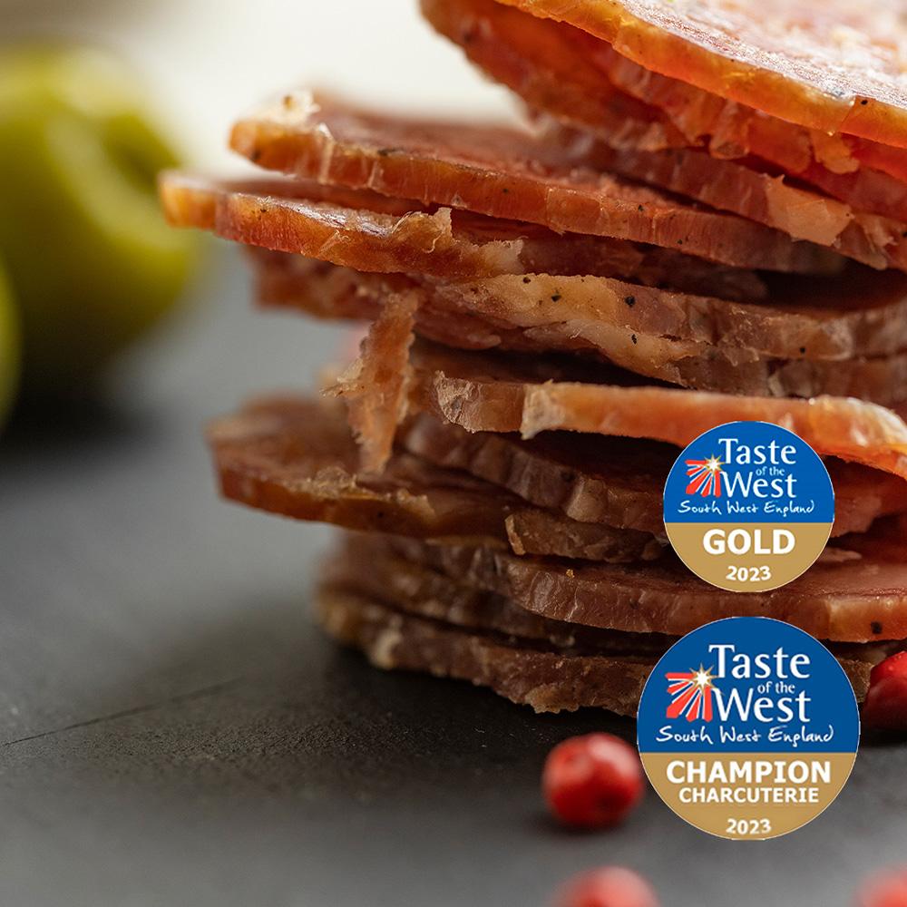 Free-range pork is cured with garlic, black pepper, ginger, white pepper, cloves, and mace and then whole pink peppercorns are added. The aroma is enticing - with a hint of cloves and nutmeg. ​The taste of pork is to the fore with a tinge of ginger; the pink peppercorns give a mild, prickly heat and floral overtones on the finish. The sausages are fermented to give an acidic 'twang' to the flavour before slowly air drying and maturing for several weeks.