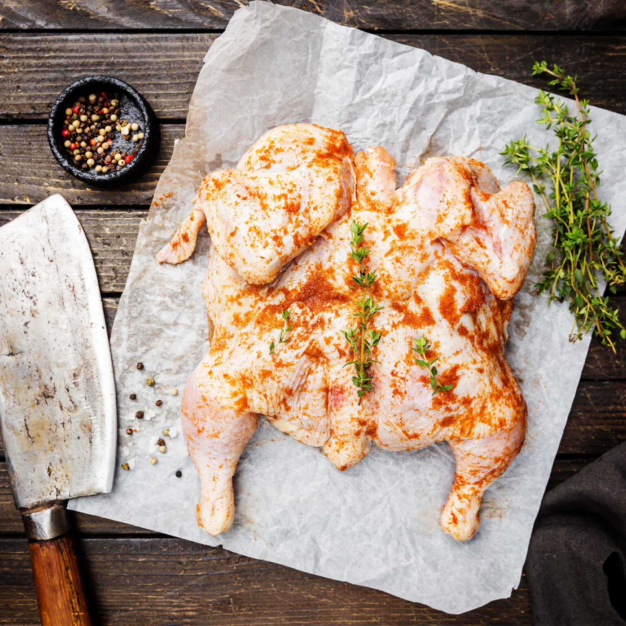 Spatchock Chicken, Flattened whole chicken. Spatchock chickens are quicker to cook.