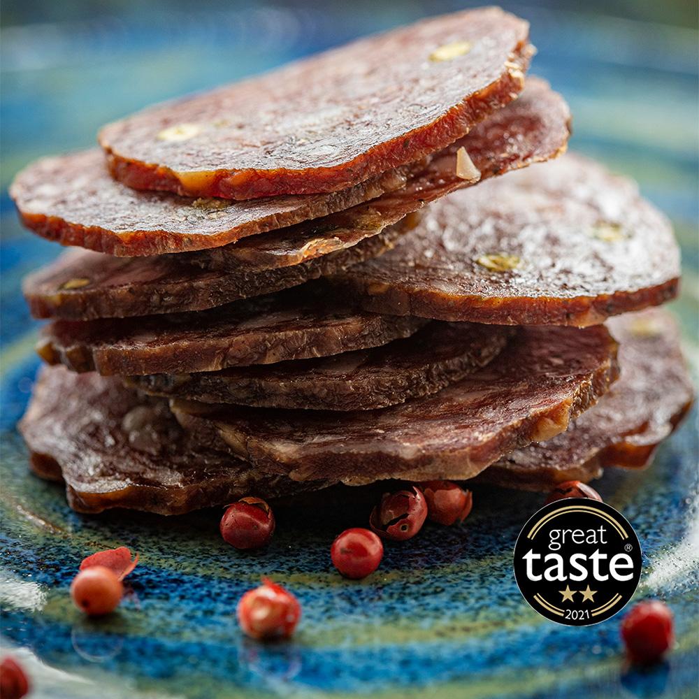 Wild venison and pork is ground and flavoured with whole Green Peppercorns, black pepper, garlic and cep powder. The sausages are filled into natural hog casings before being fermented and air-dried.